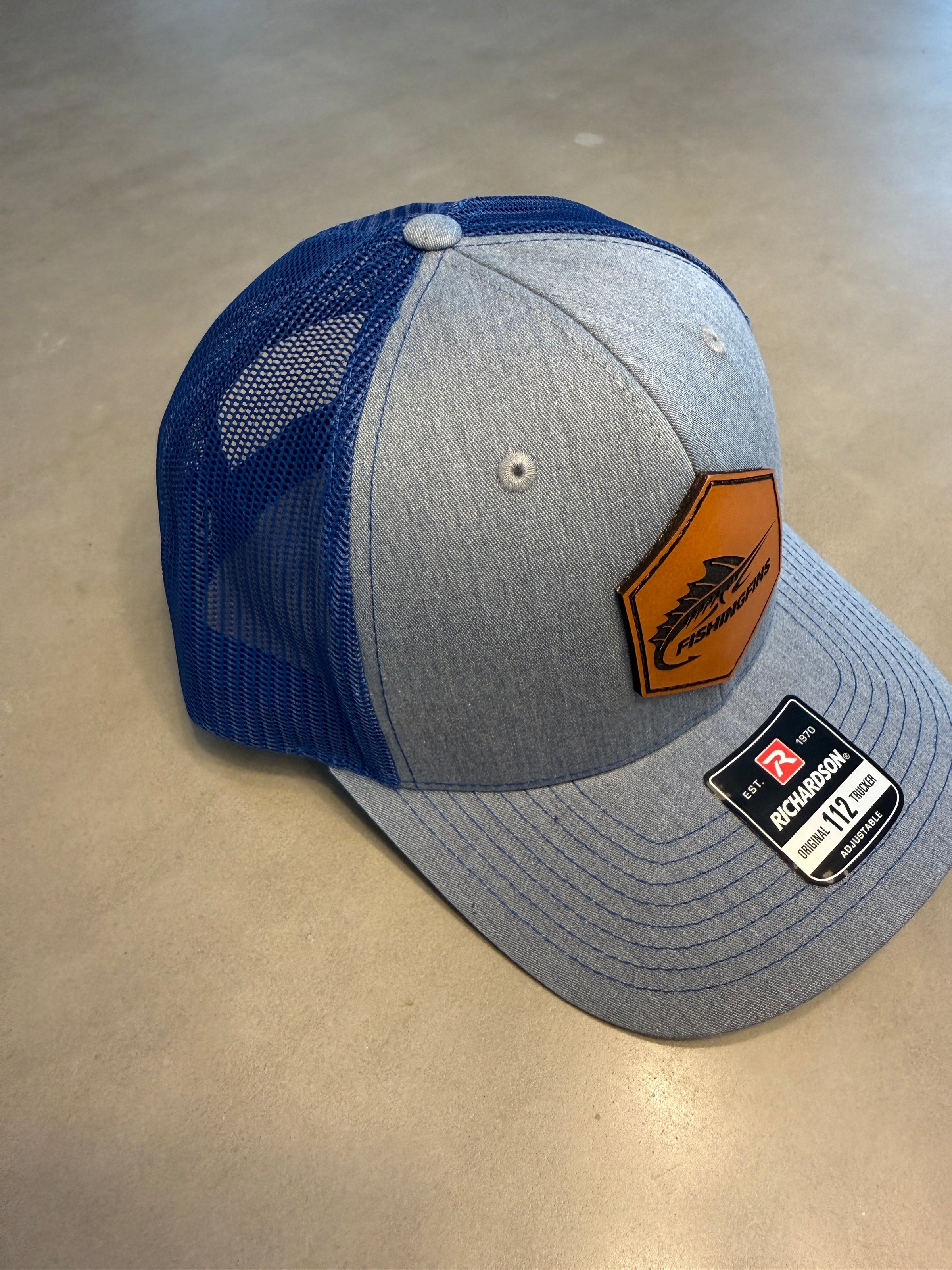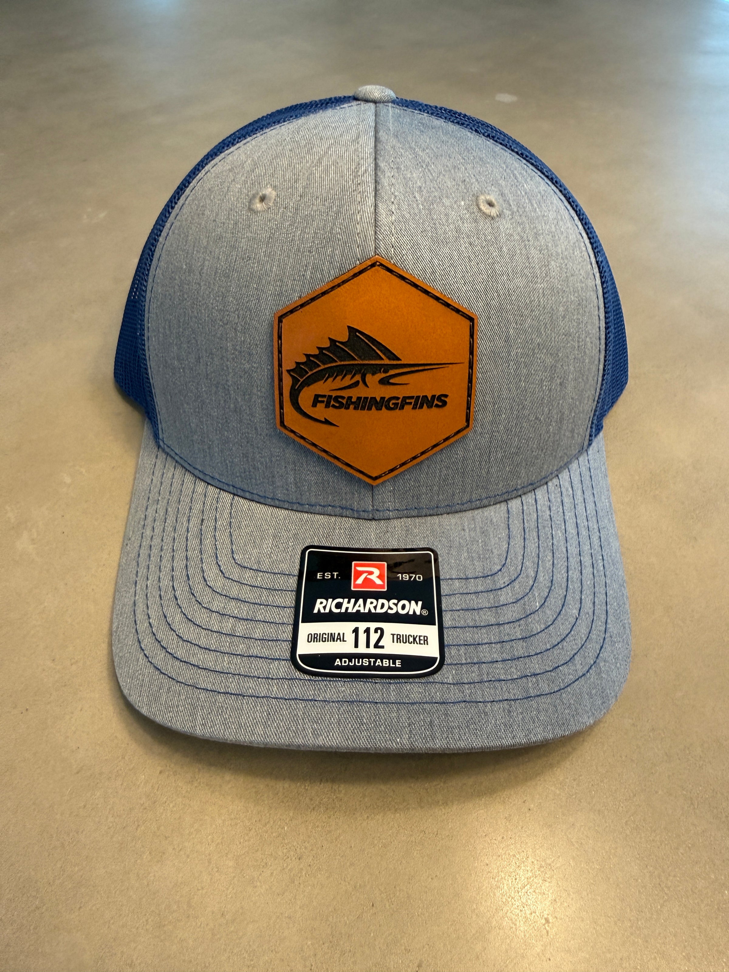 The Ultimate Fishingfins Hat with Leather Patch. Style & Color that has a perfect fit by Richardson Original 112 Trucker with the Adjustable Strap. One Size fits Most.
